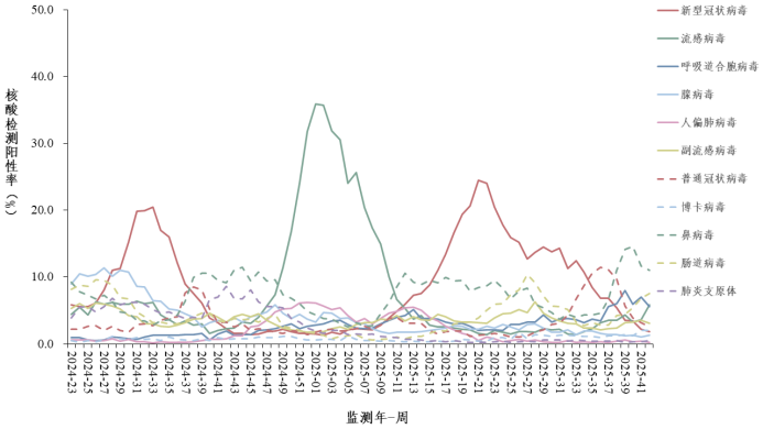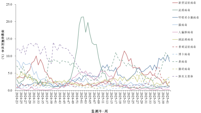 2025年第42周(2025年10月13日—10月19日),对全国哨点医院(不含港澳台)采集的门急诊流感样病例和住院严重急性呼吸道感染病例的呼吸道样本,开展新型冠状病毒、流感病毒、呼吸道合胞病毒、腺病毒、人偏肺病毒、副流感病毒、普通冠状病毒、博卡病毒、鼻病毒和肠道病毒等10种病毒以及肺炎支原体在内的多种呼吸道病原体检测。