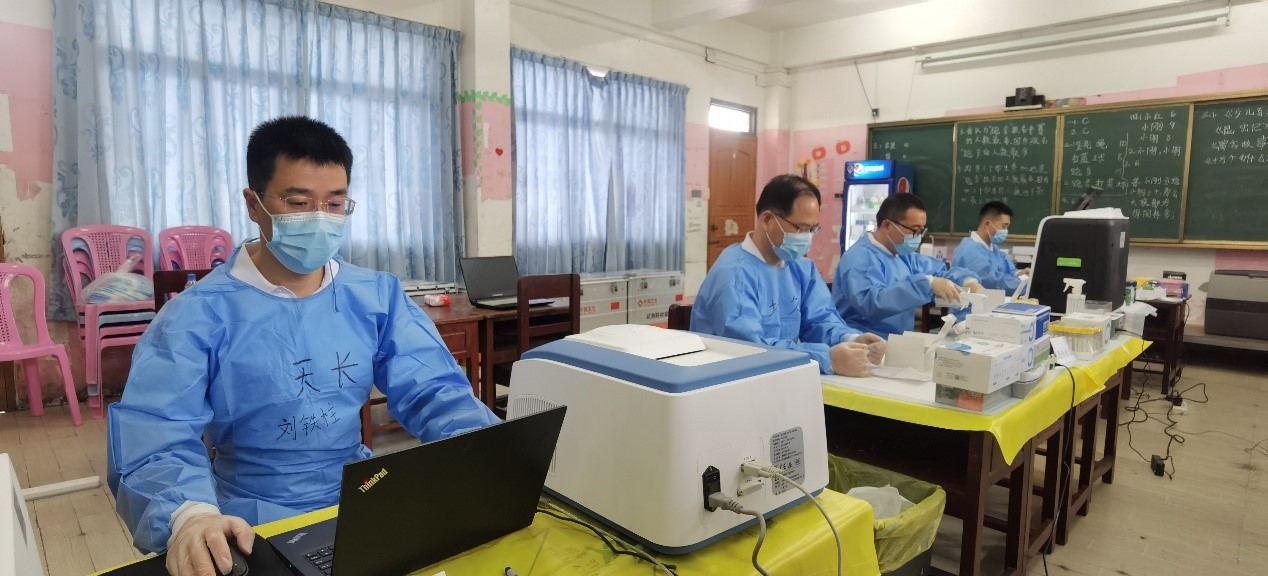 4月21日,刘铁柱(左一)、熊衍文(左二)在病原检测临时实验室进行设备调试和呼吸道多病原核酸检测测试