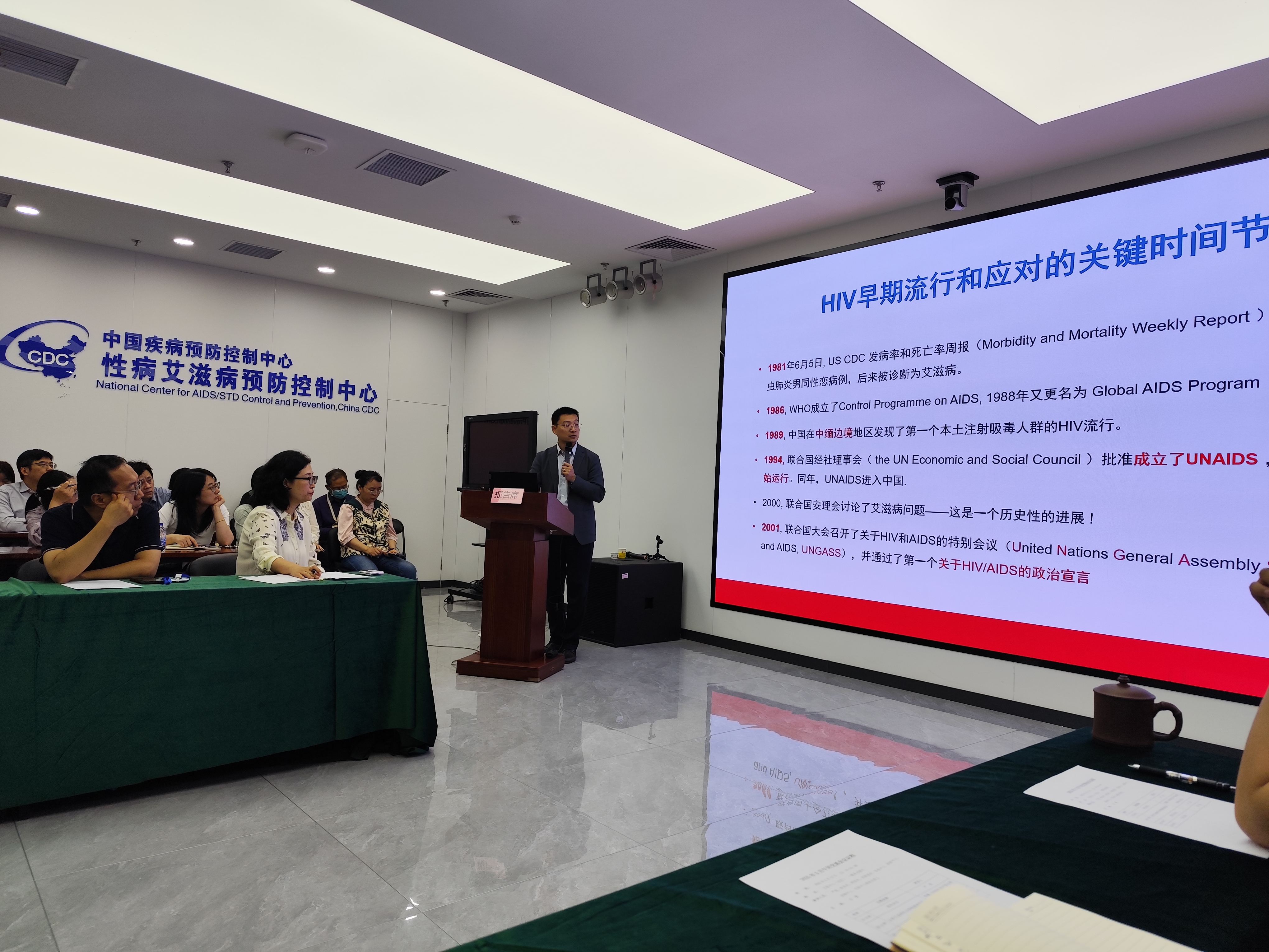 会议邀请联合国艾滋病规划署驻中国全球协调办公室战略信息顾问、高级项目官员郭巍,介绍全球艾滋病防治策略措施进展、存在问题和挑战以及青年人提升国际合作能力等方面的经验。与会人员进行了充分交流和讨论。
