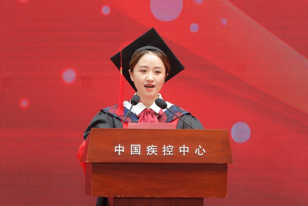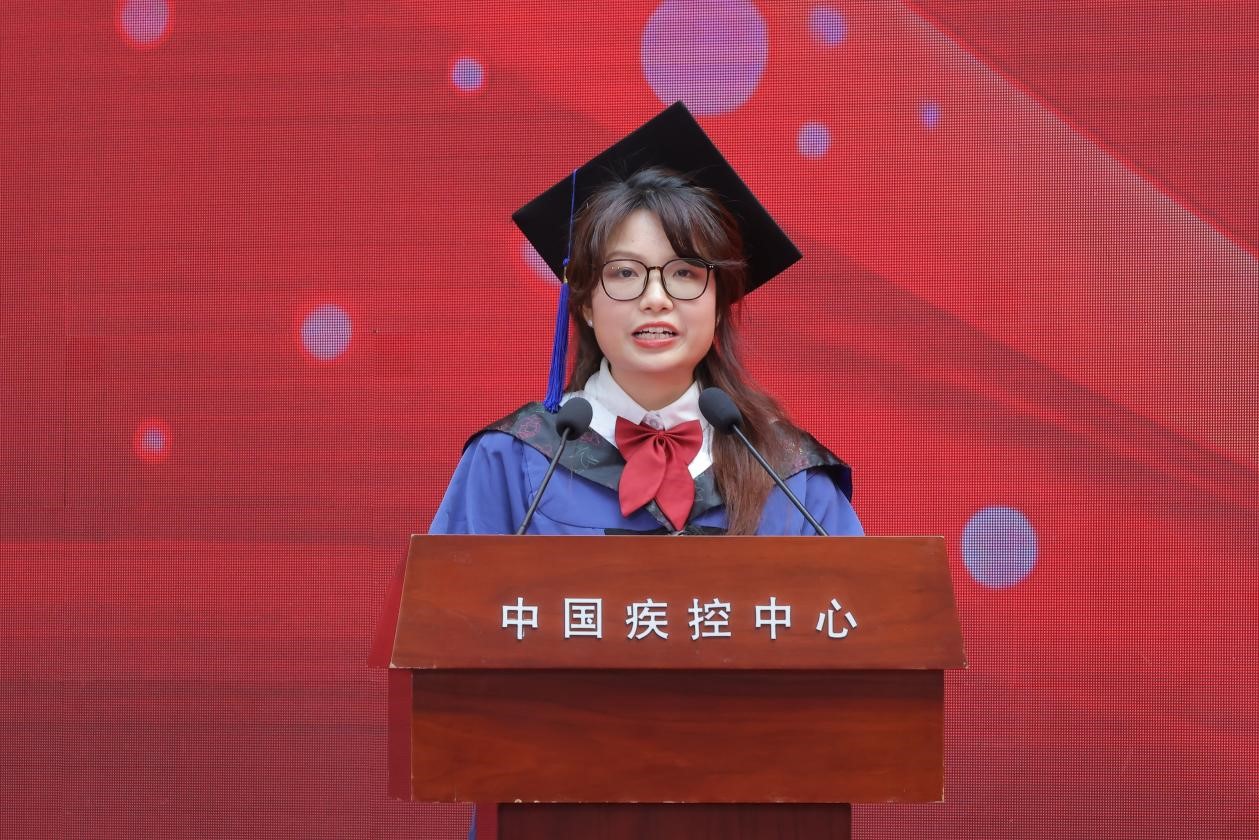 毕业生代表、病毒病所2022级博士研究生刘莹分享了从“求知”到“自知”的成长感悟,表示在中心(院)的求学经历不仅培养了她的科研能力,更在精神、思维与自我认知层面进行了淬炼与提升。毕业生代表、营养所2022级公共卫生硕士研究生南晶讲述了她如何通过科研与实践并重的经历,深刻体会到“把论文写在祖国大地上”的重要意义。在读生代表、艾防中心2023级硕士生谭梦楠分享了他所经历的中心(院)发展变化以及从师兄师姐身上学到的严谨、求实与担当的精神。