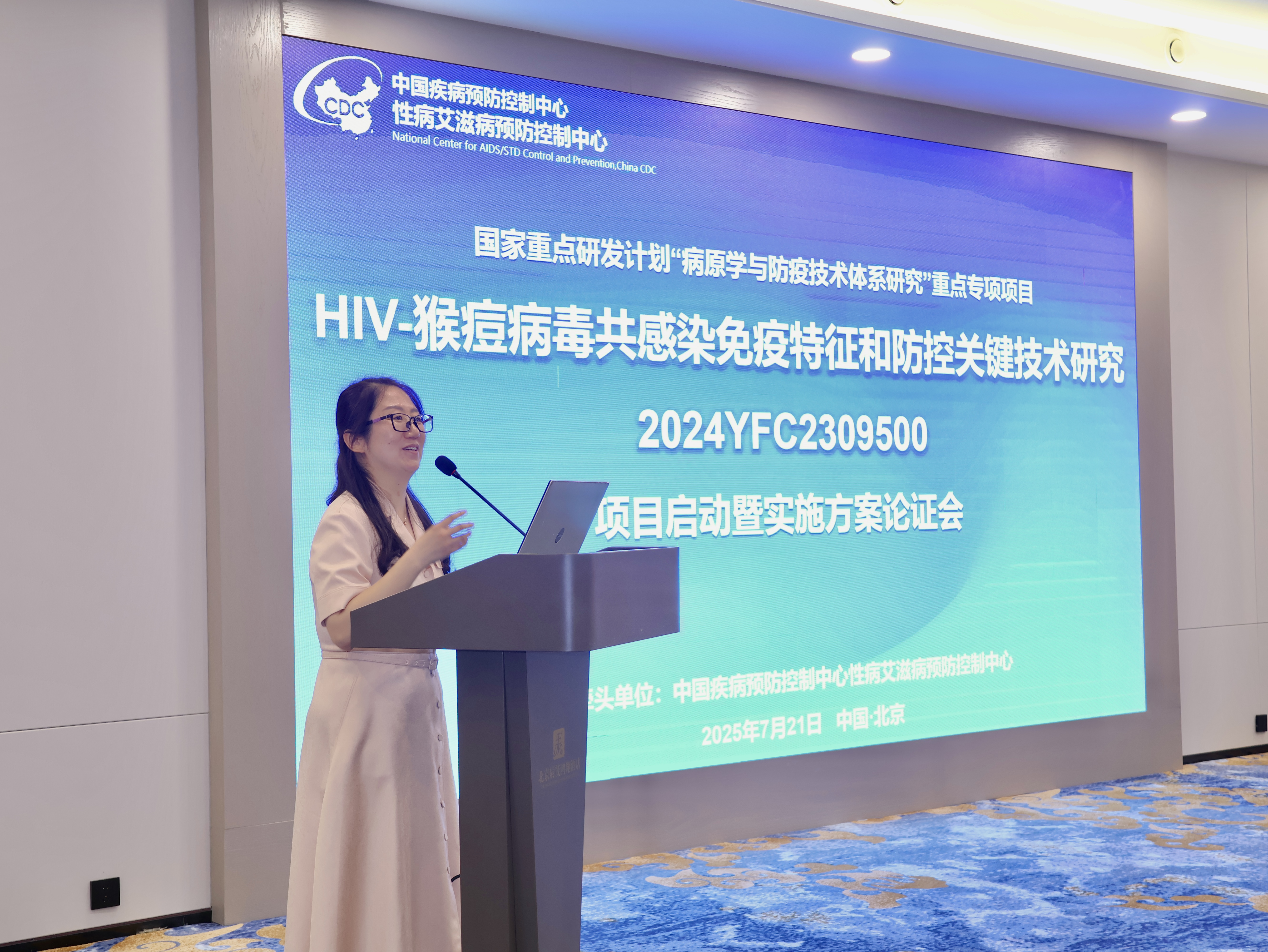 2025年7月21日,由 性病艾滋病预防控制中心〔以下简称艾防中心〕李丹研究员牵头的国家重点研发计划“HIV-猴痘病毒共感染免疫特征和防控关键技术研究”项目启动暨实施方案论证会在北京顺利召开。 (中国预防医学科学院)主任(院长)王健伟、国家卫生健康委医药卫生科技发展研究中心项目管理二处副处长王敏、艾防中心副主任吕繁出席会议并讲话。项目指导专家及项目组成员等50余人参加会议。